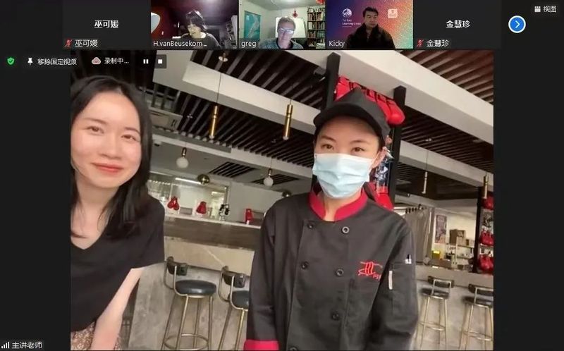 3月9日的第一次实境直播以“校园之旅”为主题,学员与在校留学生连线,完成了“自我介绍”的语言交际任务。6月15日,教师团队结合学员反馈及需求,配合教学进度,以“一起去喝下午茶”为主题设计了第二次课程。课堂围绕“如何点餐”这一语言交际任务,通过西餐厅线下点餐及手机外卖平台线上点餐两种形式,为新西兰学员带来了一次与众不同的上课体验。