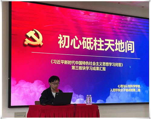 来自心理与认知科学学院的第二小组介绍了《习近平新时代中国特色社会主义思想学习问答》一书的第三板块“初心砥柱天地间(17—23讲)”,主要讨论了“我们党作为百年大党,为什么必须始终牢记使命和初心”、“不忘初心,我们应该怎么做”、“为什么说人民对美好生活的向往是我们党始终不渝的奋斗目标”、“为什么说人民是我们党执政的最大底气”、“为什么说只有中国共产党才能让中华民族实现伟大复兴”、“为什么说实现伟大梦想必须进行伟大斗争、建设伟大工程、推进伟大事业”这六大问题。