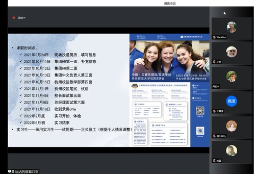 19级研究生支部党员詹婕分享了去杭州钱江贝赛斯外籍人员子女学校的求职经验,建议大家在求职期间,做到心态摆正,不必太焦虑;做好准备,未雨绸缪;慎重选择学校,实习感觉不好可以及时止损;扩宽信息渠道等。