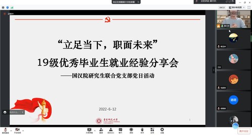 6月,向来是结束与开始的交接点,而在国汉学院学生党支部中,更是分享经验、传递鼓励的温暖时刻。2022年6月12日,国汉学院研究生2019级、2020级党支部联合举办“立足当下,职面未来”优秀毕业生就业经验分享会,旨在帮助学院内外更多同学在求职中明确方向、清晰定位。