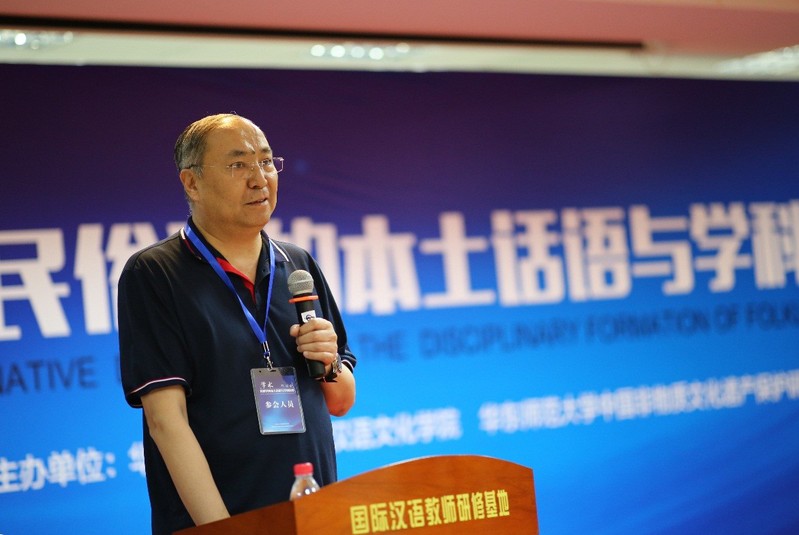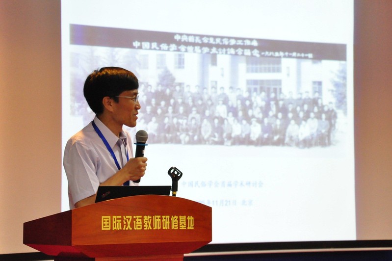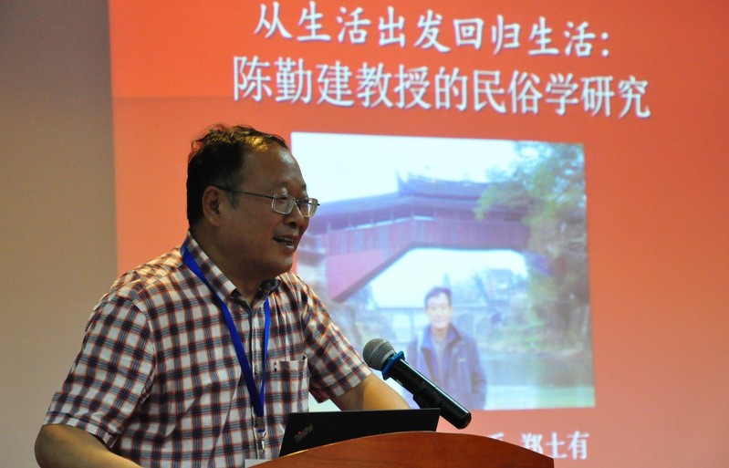 嘉宾致辞结束,由中国民俗学会副会长、中国社科院文学研究所民间文学室主任安德明主持了大会主题发言,共有六位专家学者分享了自己的学术研究成果及与陈勤建教授的学术友谊。叶涛教授(中国社科院世界宗教研究所研究员、中国民俗学会副会长兼秘书长)、吕微教授(中国社科院文学研究所研究员,原民间文学教研室主任)、黄永林教授(华中师大国家文化产业研究中心主任,华中师范大学原副校长)、杨利慧教授(北京师范大学文学院副院长)、郑土有教授(中国民俗学会副会长,复旦大学中文系教授)或分享了最新的民俗学研究成果,或阐述了陈勤建教授在民俗学研究中的独特见解和原创理论,现场反响热烈。本院尹笑非副教授亦从教学的角度,阐述了陈勤建教授在汉语国际教育及国际文化传播中的民俗学理念与实践。