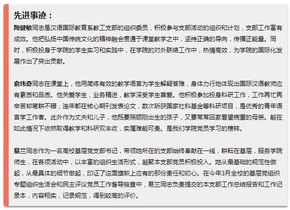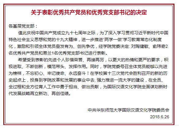 为深入学习贯彻习近平新时代中国特色社会主义思想和党的十九大精神,进一步推进“两学一做”学习教育常态化制度化,激励和引领全体党员奋发有为、创先争优,经学院党委决定,对陶健敏、俞玮奇2名优秀共产党员和易兰1名优秀党支部书记进行表彰。