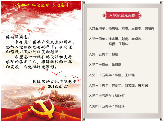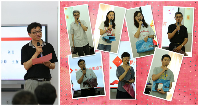 本年度,恰逢一批党员同志入党满五周年、十周年,甚至四十五周年,院长、院党委副书记张建民宣读了“入党纪念光荣榜”名单,院党委书记黄薇、院长、院党委副书记张建民和院党委委员、副院长刘承峰为大家赠送了贺卡及纪念品。每位党员教师一一发表感言,表示要不忘初心、牢记使命、坚定不移跟党走。