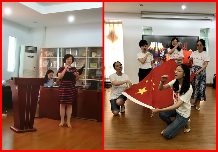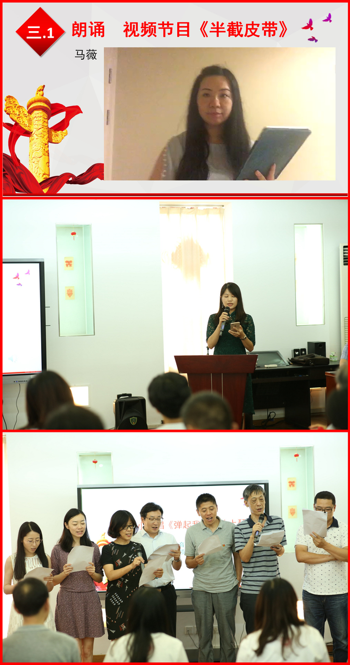 国际汉语教师研修基地党支部马薇朗诵的《半截皮带》(视频节目),带大家重温了一个红军长征历程中的感人故事。汉语文化教学中心教工党支部文娟朗诵诗歌《无论如何》,表达了一个合格的共产党员在和平年代应有的坚定不移的信念和忠诚无私的品格。汉语国际教育系党支部合唱《弹起我心爱的土琵琶》、院部管理教工党支部以及退休党支部共同表演歌舞《绣红旗》,重现了党的发展历程中革命先烈前赴后继的奉献以及伟大的革命乐观主义精神。