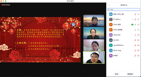 2月3日,大年初三,为帮助语言直播课授课教师了解阿联酋文化禁忌和学生学习习惯,提高教学水平和项目质量,华师大团队特邀驻阿中文专家和资深本土中文教师为语言直播课任课教师张平、崔丽巍进行了培训。培训会上,中文课程组成员贾昊、本土教师江晨皓、闵海伟等老师分享了他们宝贵的经验和建议,对两位授课老师更好开展针对阿联酋的语言直播课教学大有裨益。
