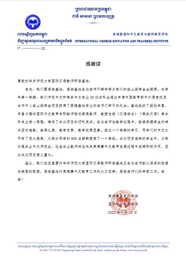 由教育部中外语言交流合作中心支持的柬埔寨国际中文教师线上奖学金专项研修项目春季课程于近日圆满结束,来自柬埔寨的38名中文学生在线上完成了20周的中文课程学习。本次线上奖学金生均来自柬埔寨皇家科学院国际中文教育学院的中文专业本科生,其中大部分为本土中文师范生。好色tv 作为柬埔寨皇家科学院本土汉语师范专业的联合培养单位,协助柬埔寨培养了30余名本土中文种子教师,这些本土教师将以点带面推动柬埔寨中文教学工作发展,意义重大。