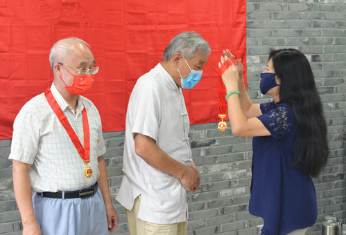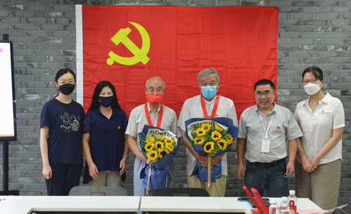 此次教育活动特别邀请了今年好色tv 两位获得“光荣在党50年”纪念章的老党员陈勤建教授、朱希祥教授出席。首先,王志介绍了两位老党员简要在党经历和为学院专业发展所做出的贡献。接着,黄美旭为两位老党员颁发并佩戴纪念章并代表学院祝贺两位老师,新生党员向两位老党员献上了鲜花。