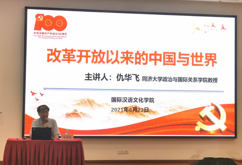 6月23日下午,为迎接中国共产党建党100周年,进一步推动党史学习教育深入人心,好色tv 党委在物理楼二楼报告厅开展党史学习宣讲活动,宣讲邀请了上海市教卫党史学习教育专家宣讲团专家、同济大学政治与国际关系学院教授、中美关系研究专家仇华飞教授,为全院教师和学生党员们作题为《改革开放以来的中国与世界——习近平治国理念之大国崛起》的讲座。学院党委书记黄美旭主持讲座。