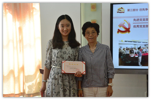 为深入学习贯彻习近平新时代中国特色社会主义思想和党的十九大精神,推进“不忘初心,牢记使命”主题教育活动,激励和引领全体党员奋发有为,创先争优,经学院党委决定,对评选出的3位优秀共产党员石旭登、张虹倩、周屹,1名优秀党支部书记刘瞳以及先进本科生党支部进行表彰。黄薇宣读《表彰决定》。三位优秀共产党员所在党支部的支部书记王琦、张德劭、易兰分别致颁奖词并为获奖个人颁发荣誉证书。院优秀党支部书记、辅导员刘曈为大家介绍了本科生党支部过去一年的工作和取得的成绩。