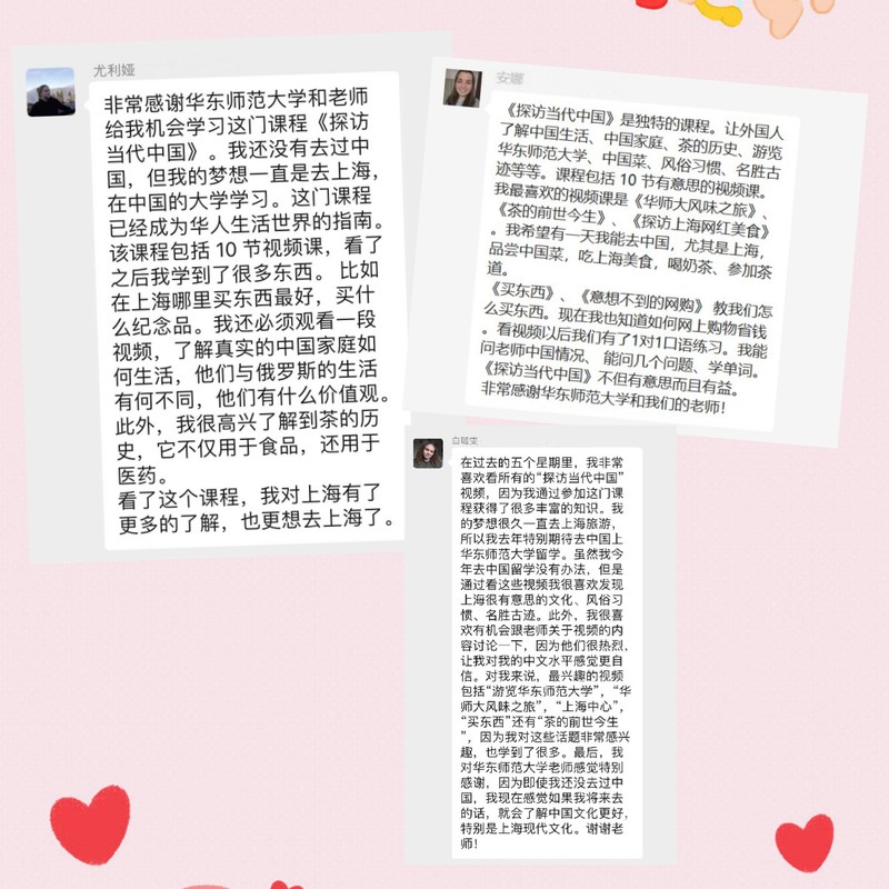 安娜(俄罗斯):我很高兴我参加了探访当代中国这个项目。我取得了宝贵的经验,如果我去中国的话,我可以更明白中国人的习惯,尤其是上海当地人。我看了和中国文化有关的视频,我还和汉语老师讨论一些问题。我很开心有机会聊这些。