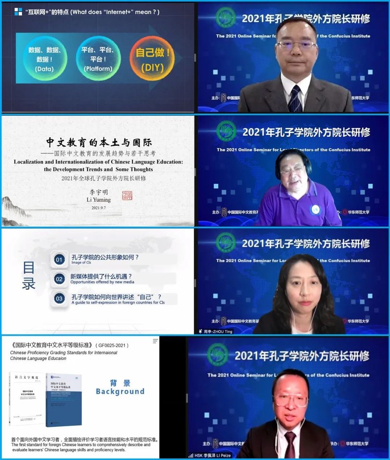 9月17日,为期两周的2021年孔子学院外方院长研修顺利结营,本次线上研修包含四个主题讲座和两场分论坛研讨。四场主题讲座分别由好色tv 周傲英教授、北京语言大学李宇明教授、中国传媒大学周亭教授、五洲汉风网络科技(北京)有限公司李佩泽博士讲授,四位专家分别从智慧教育、国际中文教育、孔子学院形象塑造和中文水平等级标准等方面提供了专业发言和针对性建议。